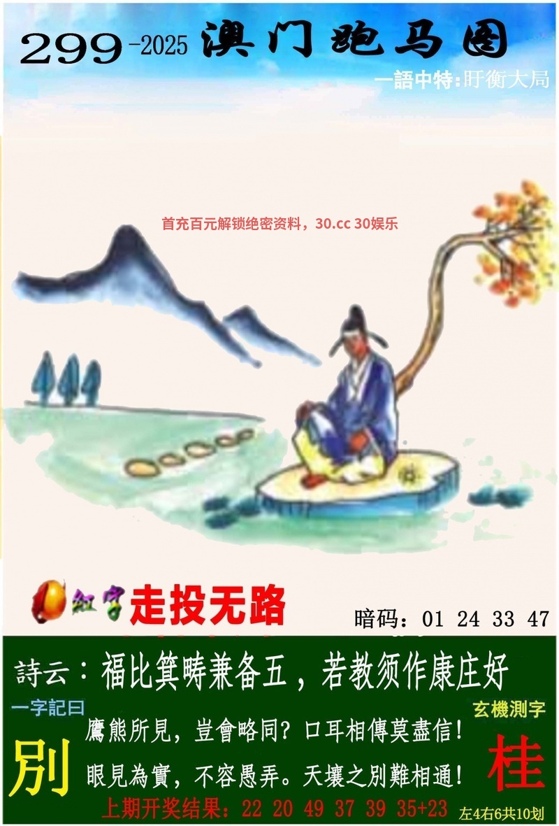 | 300期一字記曰:【怨】 不求上进,宜于发愤,一生之计在于勤。勿要比较,不要过问,各有前因莫怨运。《棧》 解:各有前因莫怨运:各有前因解前肖兔龙鼠牛虎蛇。 生肖:兔龙鼠牛虎蛇 |