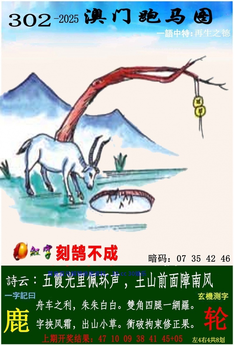 | 302期一字記曰:【鹿】 舟车之利,朱朱白白,双角四腿一网罗。字挟风霜,出山小草,冲破拘束修正果。《轮》 解:双角四腿一网罗:双角四腿解双虎马狗猴龙鼠。 生肖:虎马狗猴龙鼠 |